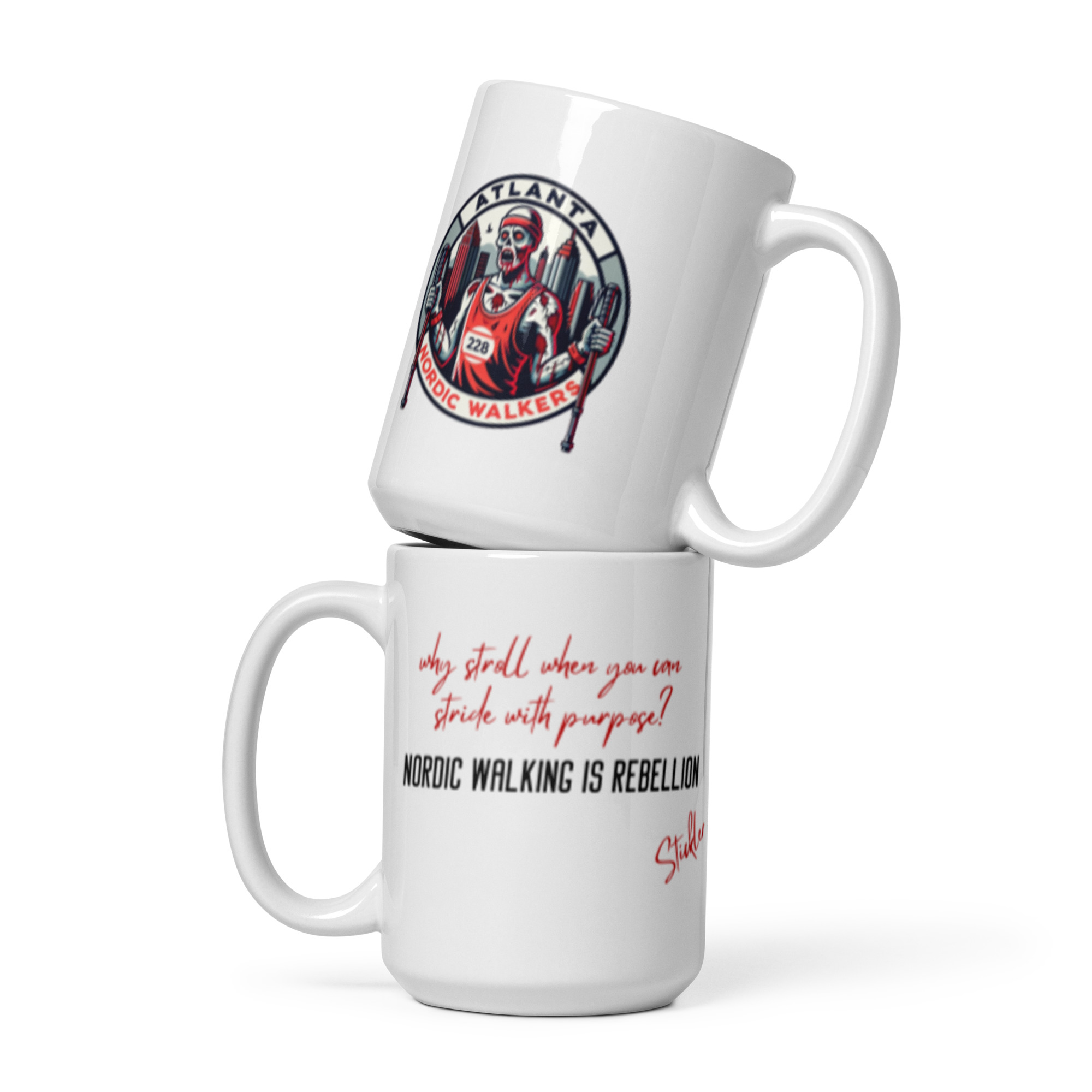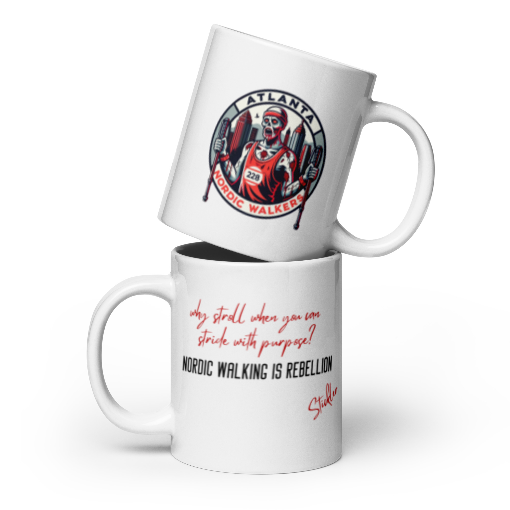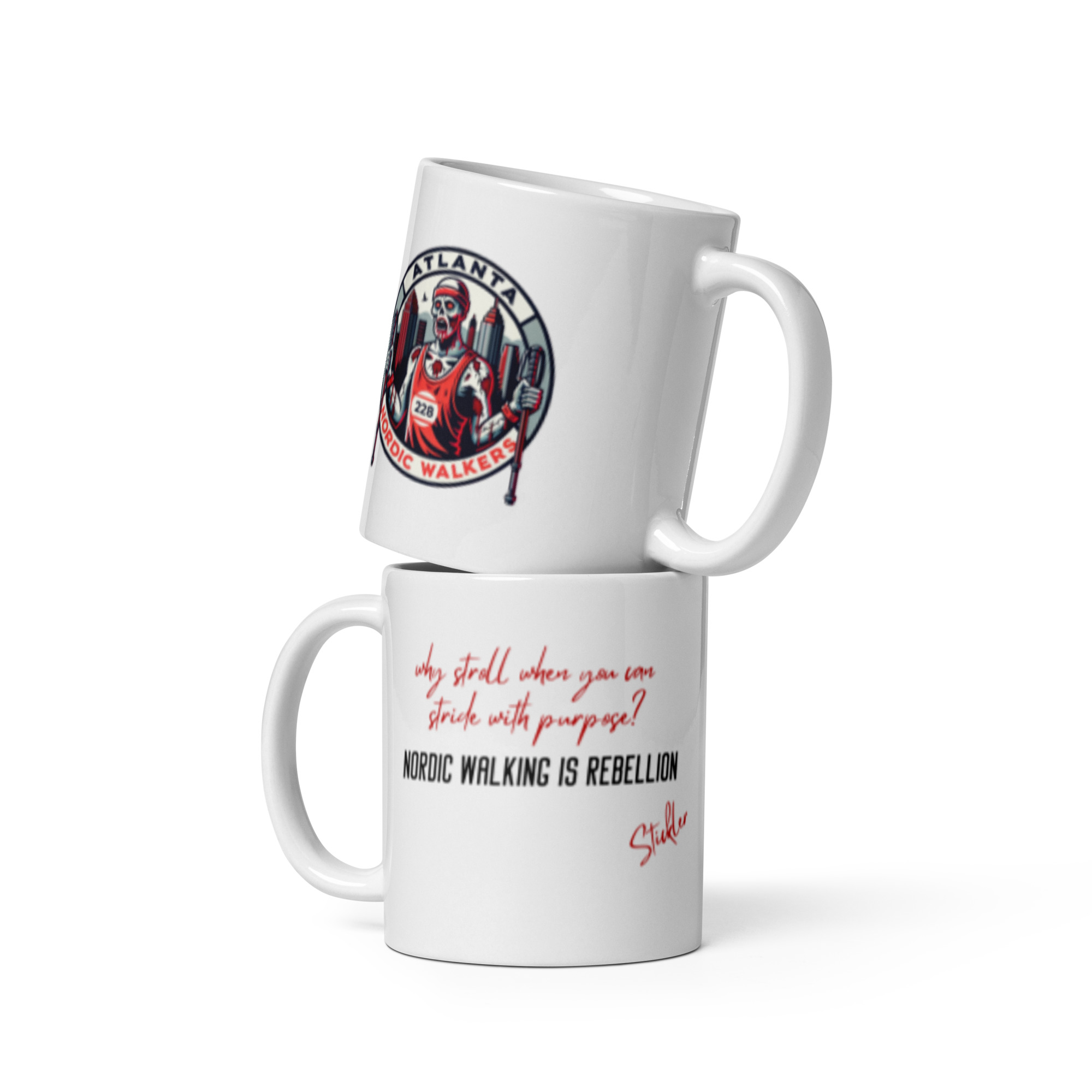 Stamped with the Atlanta Nordic Walkers logo, this is the mug for those who reject aimless wandering and embrace the precision of purposeful propulsion. Whether filled with morning motivation or post-stride reflection, this mug reminds you: Every step is a statement. Every stride is a stand.